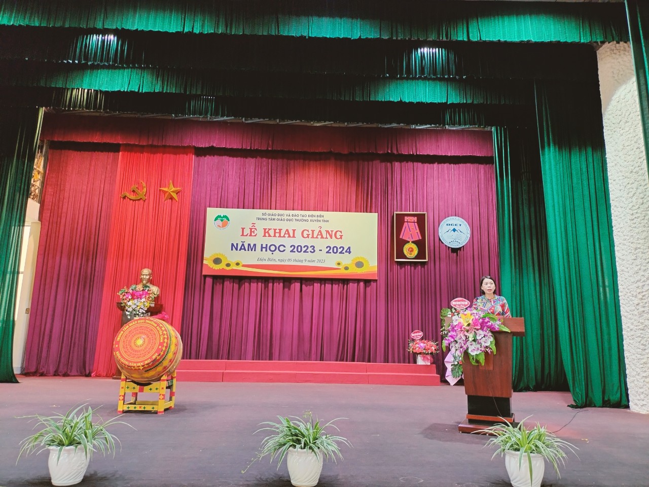 Sau phần văn nghệ sôi nổi, cô giáo Phạm Thị Duyên – Phó Giám đốc đọc Thư chúc mừng của Chủ tịch nước Võ Văn Thưởng gửi ngành Giáo dục nhân dịp khai giảng năm học 2023-2024. Tiếp nối chương trình thầy giáo Phạm Văn Cường -Bí thư chi bộ, Giám đốc Trung tâm đã đọc diễn văn khai giảng năm học mới. Trong đó, thầy ghi nhận những nỗ lực, cố gắng của thầy cô giáo và các em học viên đã đạt được trong năm học vừa qua. Chất lượng giáo dục toàn diện của từng bước được nâng lên. Số học viên xếp loại học lực từ Trung bình trở lên đạt 96,11%, (trong đó, xếp loại học lực Giỏi đạt: 6,41%; loại Khá đạt 63,62,%, loại TB đạt 26,09%, Yếu Kém: 3,89%). Số học viên được xếp loại hạnh kiểm Khá- Tốt đạt 93,36%. Tỷ lệ tốt nghiệp THPT năm 2023 của Trung tâm GDTX tỉnh đạt 99,25% . Năm học 2022-2023, Trung tâm được UBND tỉnh công nhận đạt danh hiệu “Tập thể Lao động xuất sắc”.
