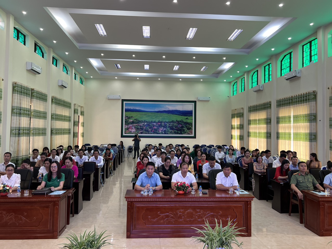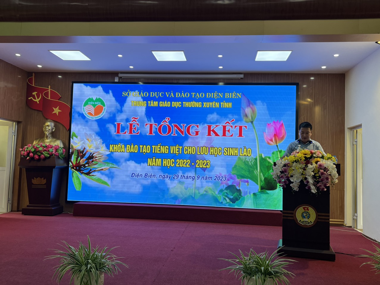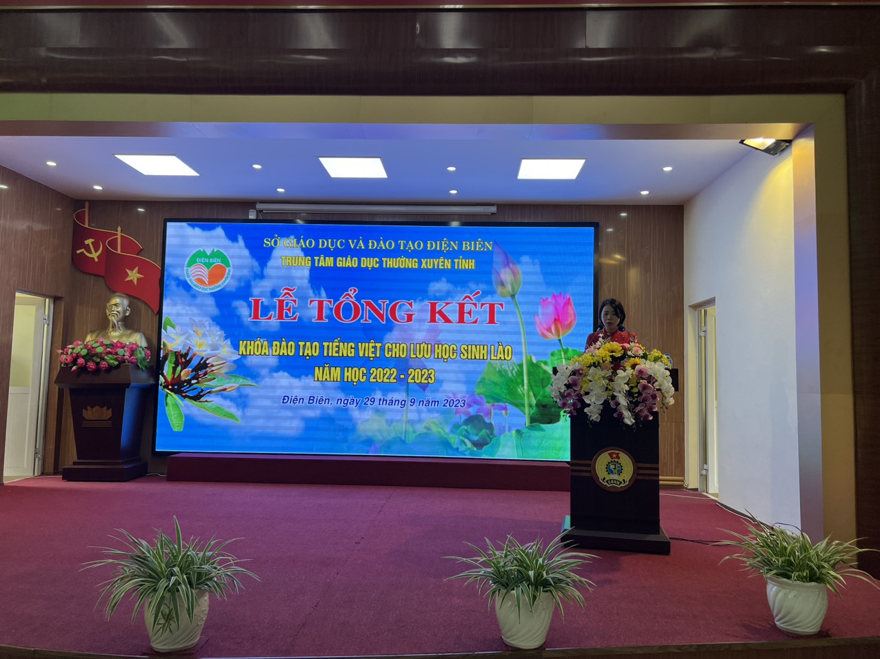 Sau chương trình văn nghệ do các em lưu học sinh Lào biểu diễn, Cô giáo Phạm Thị Duyên - Phó Giám đốc Trung tâm đã trình bày Báo cáo tổng kết quá trình tổ chức, quản lý và đào tạo tiếng Việt cho lưu học sinh nước CHDCND Lào năm học 2022- 2023. Trong năm học vừa qua, Trung tâm đã nhận được sự quan tâm, chỉ đạo sát sao của Tỉnh ủy- HĐND -UBND tỉnh, Sở Giáo dục và Đào tạo tỉnh Điện Biên và sự phối hợp chặt chẽ của các Sở, Ban, Ngành trong tỉnh trong công tác quản lý và đào tạo tiếng Việt cho lưu học sinh của các tỉnh Bắc Lào. Đây cũng là năm học đầu tiên Trung tâm thực hiện Chương trình dạy học và kiểm tra đánh giá tiếng Việt theo Khung năng lực tiếng Việt dùng cho người nước ngoài. Mặc dù còn nhiều những khó khăn, bỡ ngỡ, song các giáo viên đã tích cực tự học, tự bồi dưỡng, trao đổi học hỏi kinh nghiệm của các tỉnh bạn; thảo luận, thống nhất nội dung, phương pháp giảng dạy cho từng bài, từng phần nhằm đạt được kết quả tốt nhất. Kết quả đánh giá định kỳ của Trung tâm qua các phần Nghe, Nói, Đọc Viết có gần 60% lưu học sinh đạt bậc 3 trở lên theo Khung năng lực tiếng Việt dùng cho người nước ngoài.