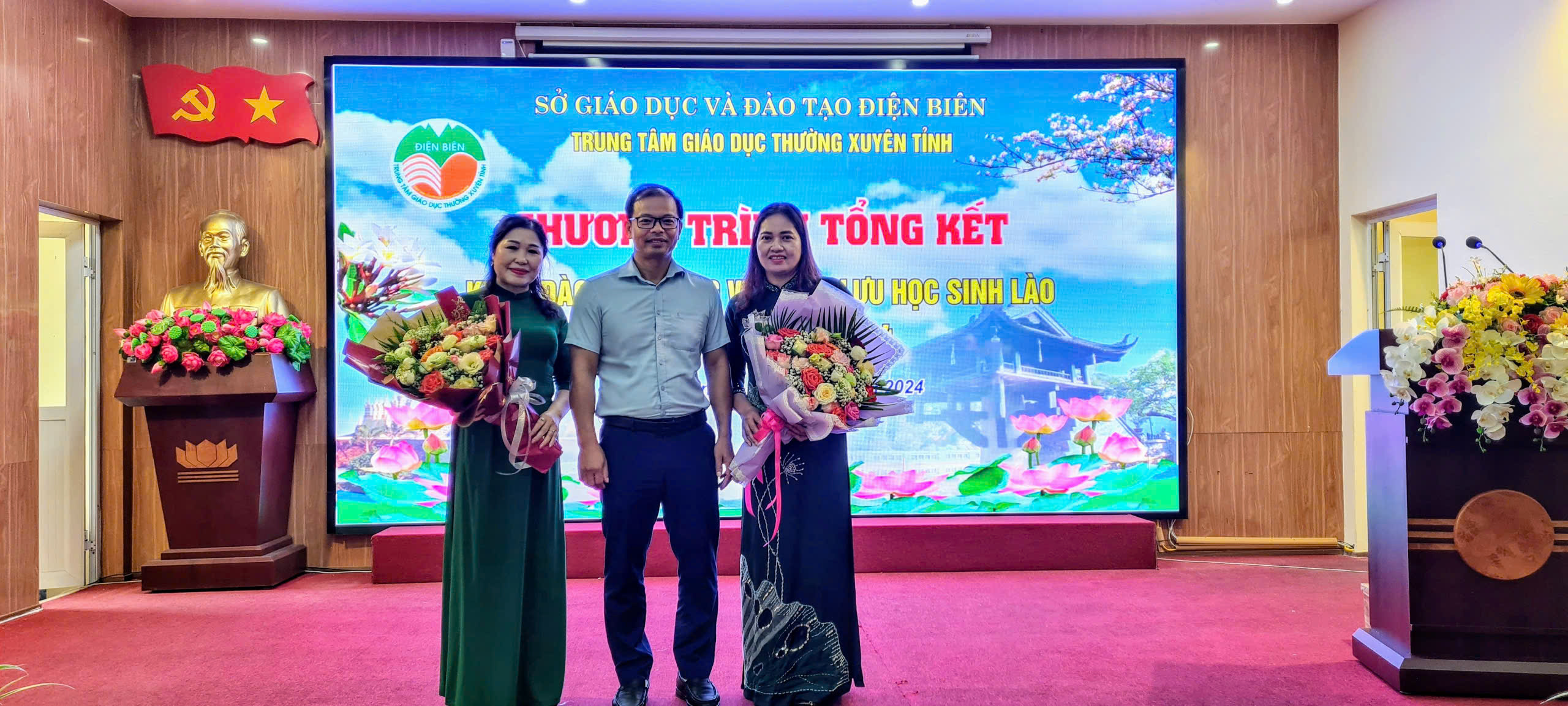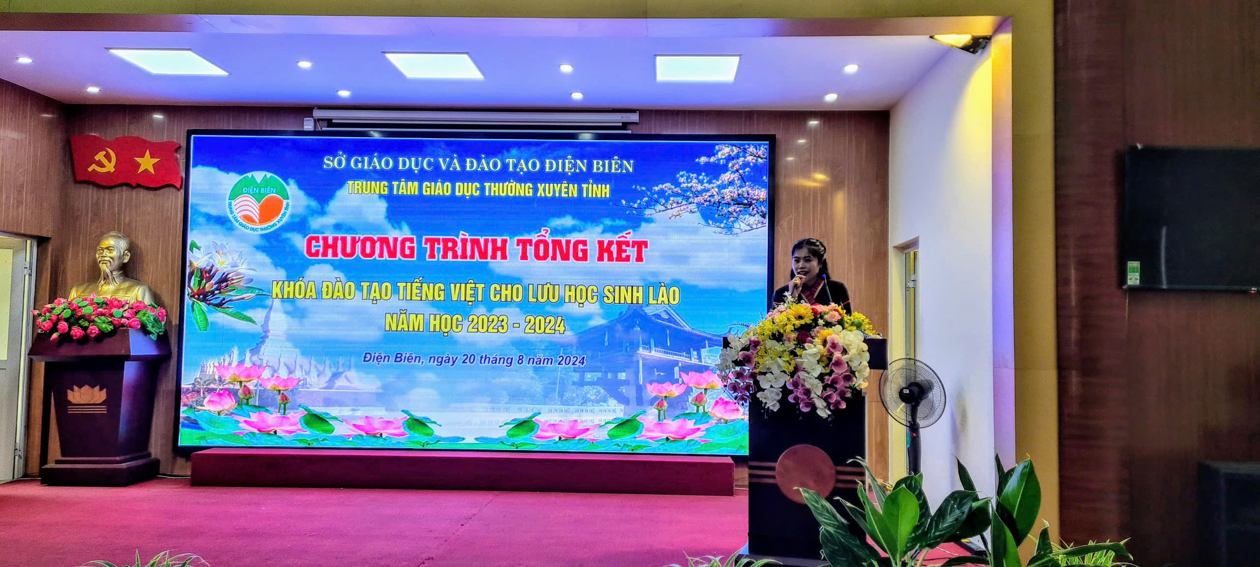 Đại diện cho 37 lưu học sinh Lào, em Nang Tình Pha Vy Săn Ti Súc đã phát biểu cảm tưởng bày tỏ lòng biết ơn sâu sắc đối Tỉnh ủy, HĐND, UBND tỉnh Điện Biên, Sở Giáo dục và Đào tạo, đặc biệt là các thầy giáo, cô giáo và cán bộ nhân viên Trung tâm GDTX tỉnh Điện Điên đã dành cho các em những tình cảm đặc biệt, các em sẽ ghi nhớ không bao giờ quên những tháng ngày được sống, học tập tại Trung tâm GDTX tỉnh. Để thể hiện tấm lòng tri ân, các em kính tặng thầy cô bó hoa tươi thắm nhân dịp kết thúc khóa học.